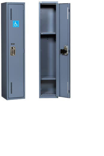 The ADA locker gets its name from the American Law (Americans with Disabilities Act), which regulates accessibility to public places. This series provides an adapted solution to individuals with reduced mobility and disabilities. These welded metal lockers contain two shelves placed at appropriate heights in order to facilitate access for the user, while still providing a perfect level of security. The lower shelf is adjustable and the upper shelf is placed at a convenient height for individuals circulating in wheel chairs. This functional product is therefore indispensable and offers quality service to individuals with reduced mobility, thereby guaranteeing full access to your facility. Many sizes are available.